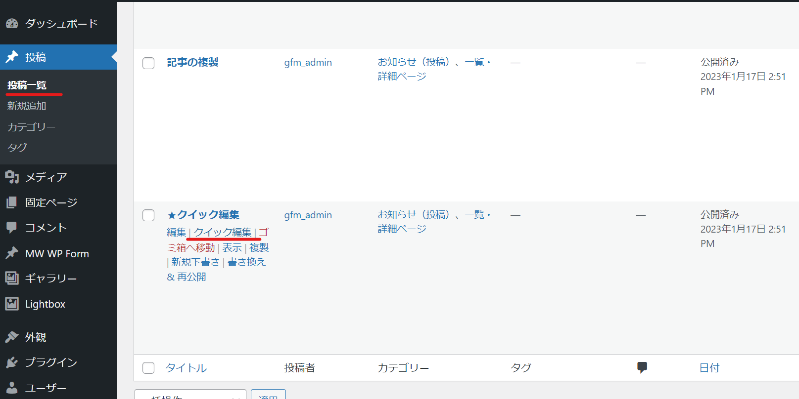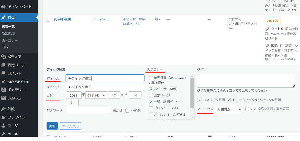 クイック編集とは、記事の一覧ページから、各記事を毎回開かなくても「タイトル」「カテゴリ」「下書きへ戻す」「公開する」などの変更が簡単に出来る機能です。