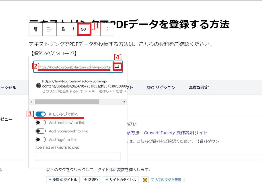 ⑤下記画像 [2] へコピーしたPDFリンクURLを貼り付けます。